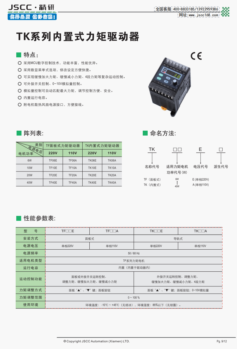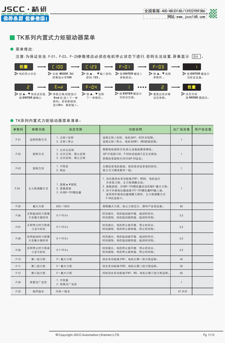 精研電機(jī)始終秉承“精益求精,研發(fā)創(chuàng)新”的理念為客戶提供優(yōu)質(zhì)可靠的產(chǎn)品。 TK系列內(nèi)置式式力矩驅(qū)動(dòng)器是專門用于控制TP系列力矩電機(jī)的產(chǎn)品,在外觀上其擁與SK系列,SKB系列相同,擁有數(shù)顯菜單,按鍵旋鈕等配置。而在功能上,其不僅可以實(shí)現(xiàn)TF系列的緩慢加大、緩慢減小力矩功能,還擁有0-10V模擬量,多段力矩調(diào)整等功能。 提示TK系列需要搭配我司TP系列力矩電機(jī)